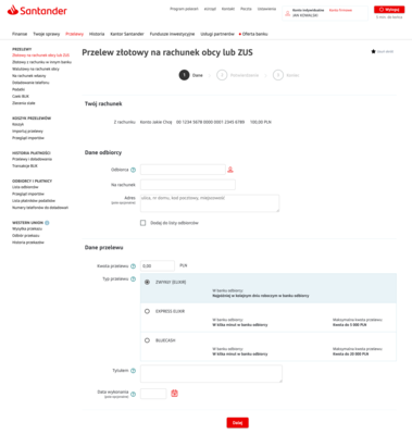 | Wpłata gotówki we wpłatomacie | 0 zł - we wpłatomatach Santander |